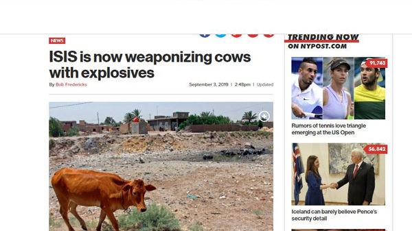 জঙ্গি গোষ্ঠী ইসলামিক স্টেট (আইএস) আত্মঘাতী হামলার নতুন কৌশল হিসেবে এখন মানুষের পরিবর্তে গরুকে ব্যবহার করছে। সম্প্রতি ইরাকের আল ইসলাহ’র গ্রামের উত্তর পাশে বিস্ফোরক বেল্ট বাঁধা দুটো গরুকে ঘুরতে দেখা