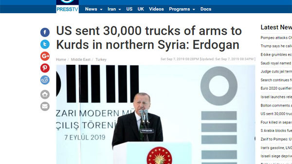 সিরিয়ার উত্তরাঞ্চলে সমরাস্ত্রবাহী ৩০ হাজার ট্রাক পাঠিয়েছে আমেরিকার। সমরাস্ত্রবাহী ৩০ হাজার ট্রাক পাঠানোর বিষয়টি তুরস্ক মেনে নেবে না বলে কঠোর হুঁশিয়ারি করেছেন তরস্কের প্রেসিডেন্ট রিসেফ তাইয়্যেফ এরদোয়ান। শনিবার তুরস্কের এসকিসেহির