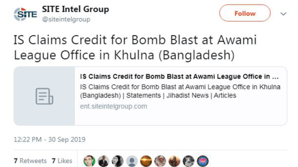 খুলনার খানজাহান আলী থানাধীন শিরোমনি এলাকায় ৩৪ নং ওয়ার্ড আওয়ামী লীগ কার্যালয়ে বোমা বিস্ফোরণের ‘দায় স্বীকার’ করেছে জঙ্গিগোষ্ঠী আইএস। মঙ্গলবার টুইটারে দেওয়া এক পোস্টে জঙ্গি তৎপরতা পর্যবেক্ষণকারী মার্কিন ওয়েবসাইট ‘সাইট