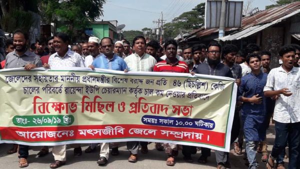 বাগেরহাটের শরণখোলা উপজেলার রায়েন্দা ইউপি চেয়ারম্যান আসাদুজ্জামান মিলন কতৃক জেলেদের জন্য প্রধানমন্ত্রীর দেয়া সহায়তার চাল কম দেয়ায় বিক্ষোভ মিছিল ও মানববন্ধন কর্মসূচী পালন করা হয়েছে। বৃহস্পতিবার সকালে শরণখোলার পাঁচরাস্তা মোড়ে